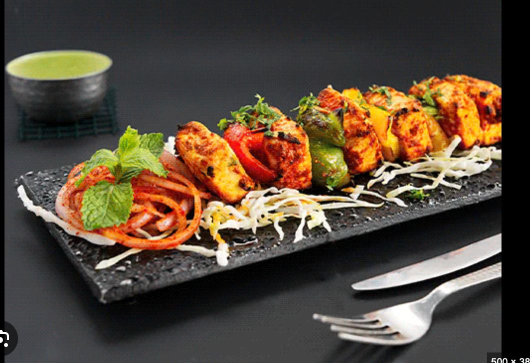 Indian cottage cheese merinated in spices , Onion, tomato, bell pepper and ketchup