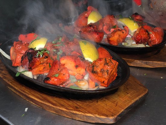 Yogurt marinated chicken baked with oven tandoor with onion tamato ginger garlic butter. cream sauce and cashew raisin