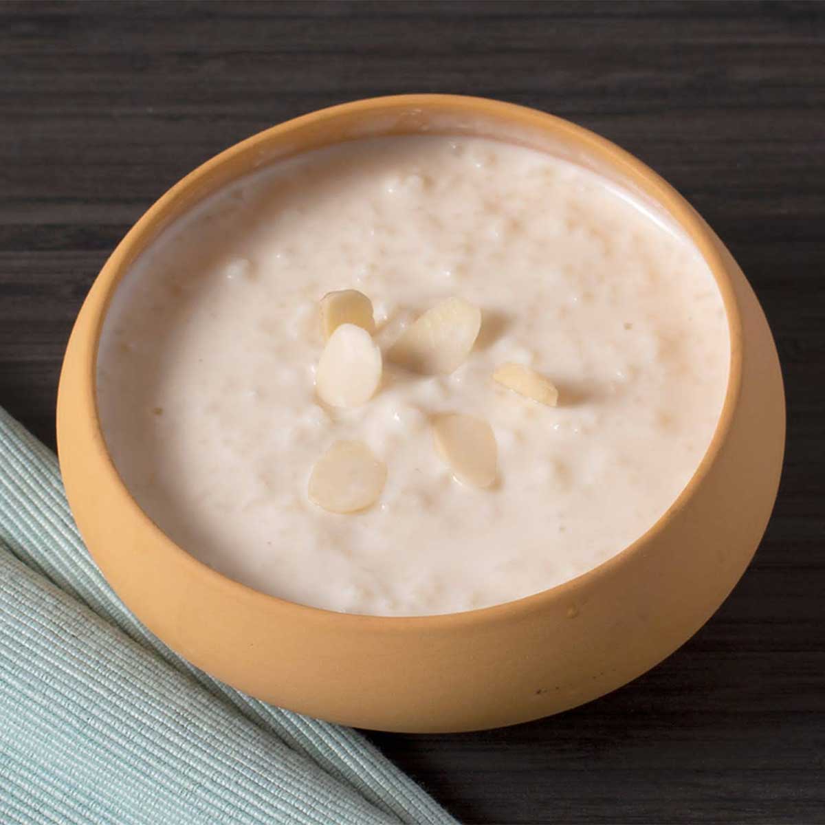 Cardamom-flavored rice pudding made with milk and garnished with cashew nuts & golden raisins