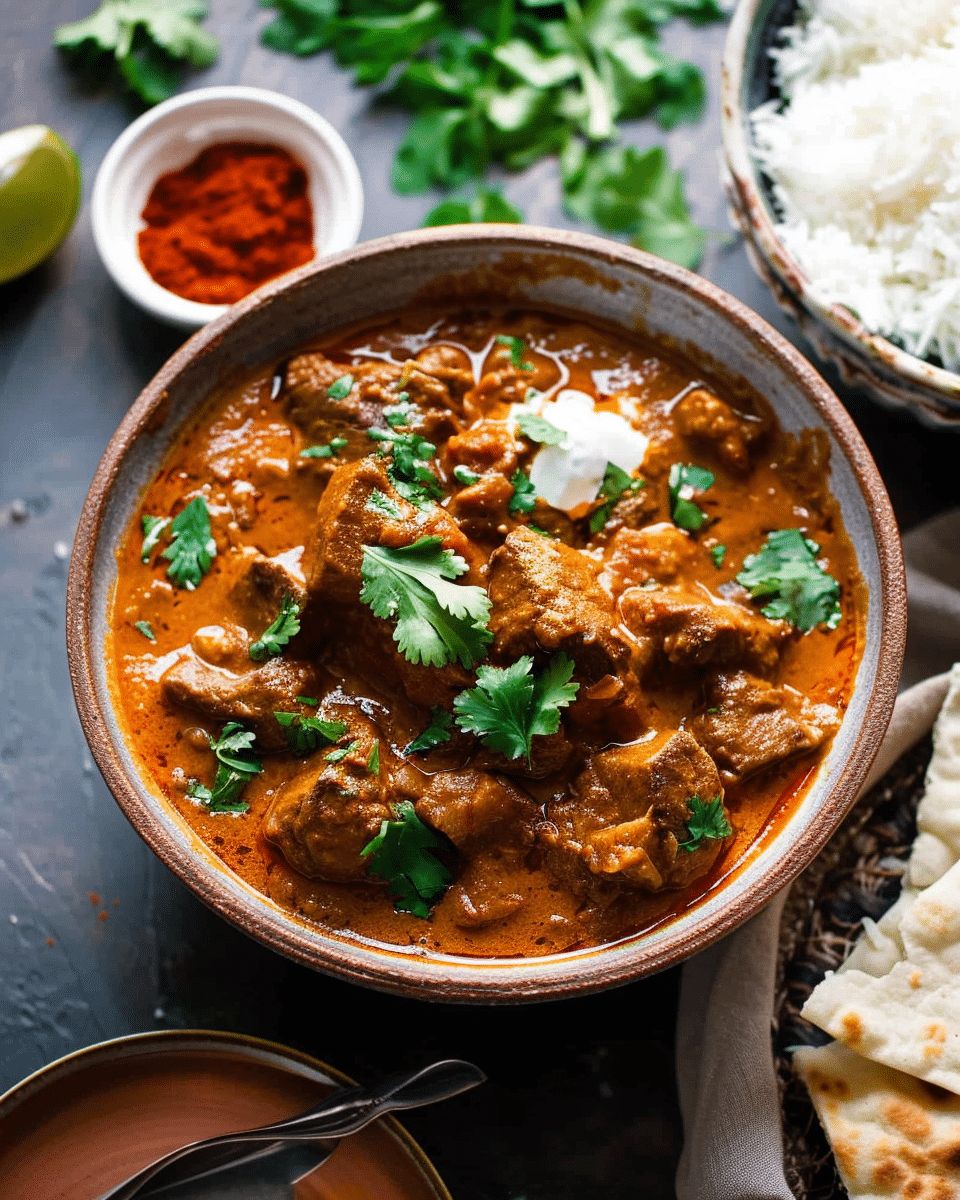 is a rich, spicy, and savory South Asian dish with a thick, tomato-based gravy, made by braising chicken with ginger, garlic, green chilies, and a blend of spices.