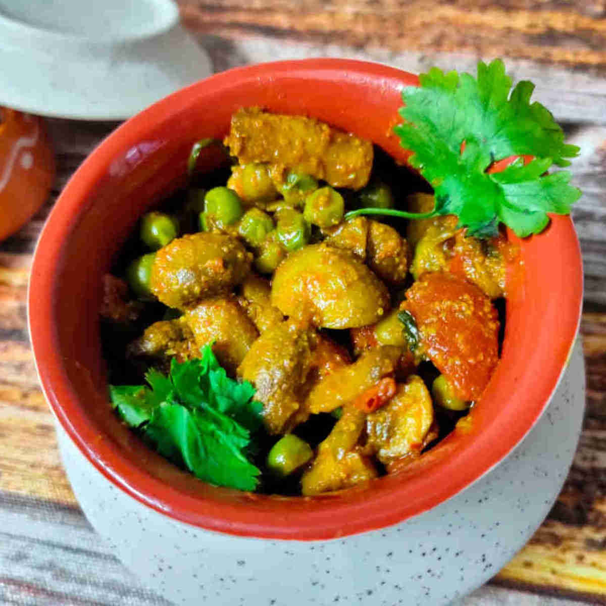 Bchicken, mushrooms and green peas cooked with onions, garlic, ginger, tomatoes, and spice